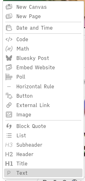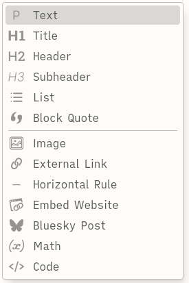 Publication pages seem to have fewer features than non-publication pages. For example: these are the available “blocks” for a publication page (like this one):